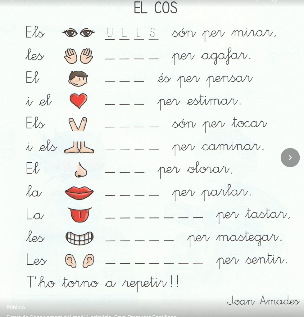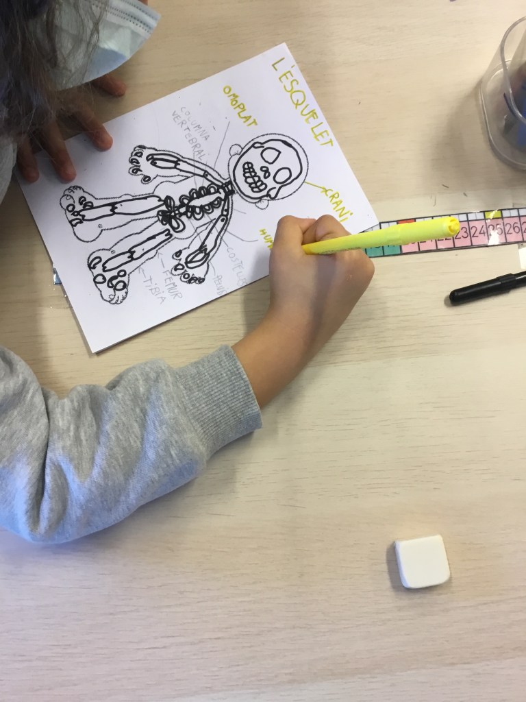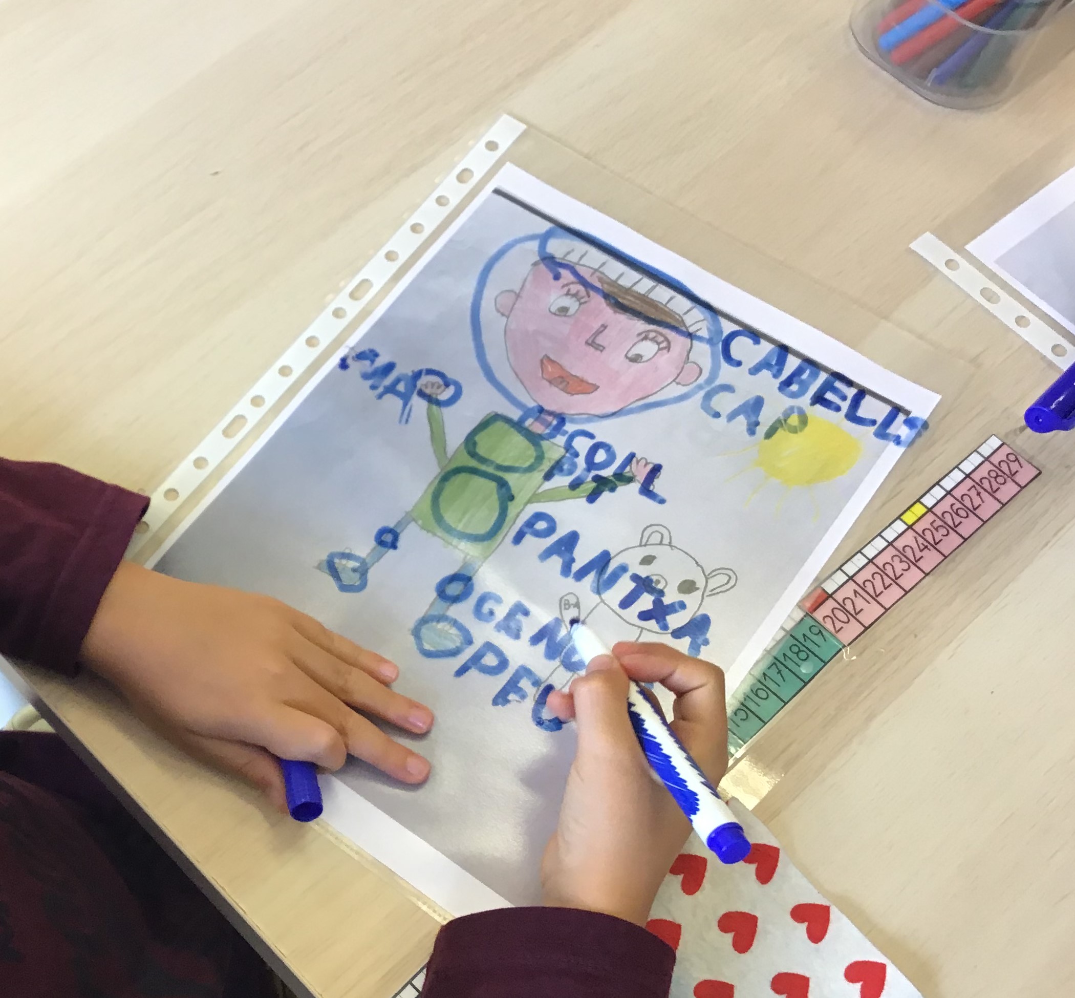 Después a nivel individual realizamos un pequeño dictado donde ellos rodeaban la parte del cuerpo mencionada y escribían su nombre. Dicho dictado lo hicimos sobre un dibujo que dibujaron sobre sí mismo al inicio de curso, cubriéndolo con una funda transparente y usando rotuladores borrables. Se lo corregían entre ellos mismos comprobando el vocabulario (reto 1).