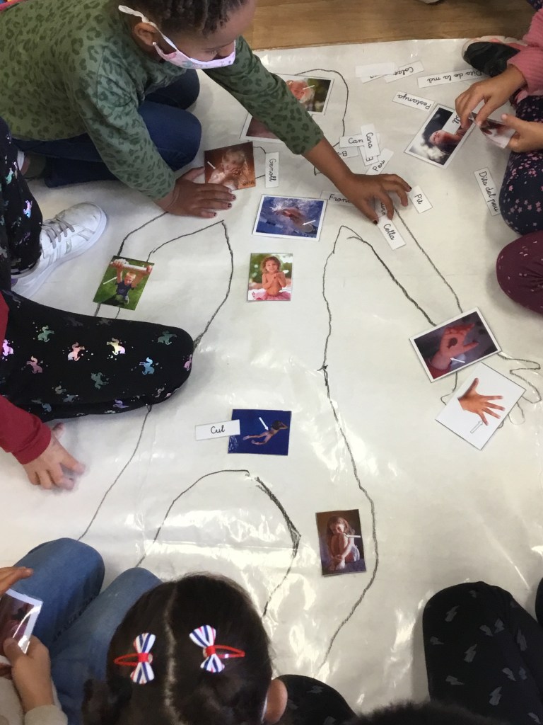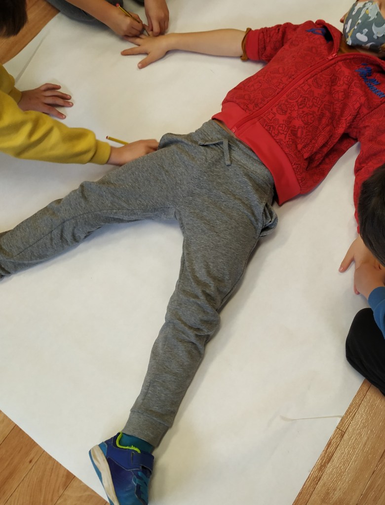 Las partes del cuerpo las trabajamos a través de una sencilla dinámica de grupo donde dibujamos la silueta de un compañero en papel continuo y señalamos con etiquetas y nombres las partes que conocíamos.