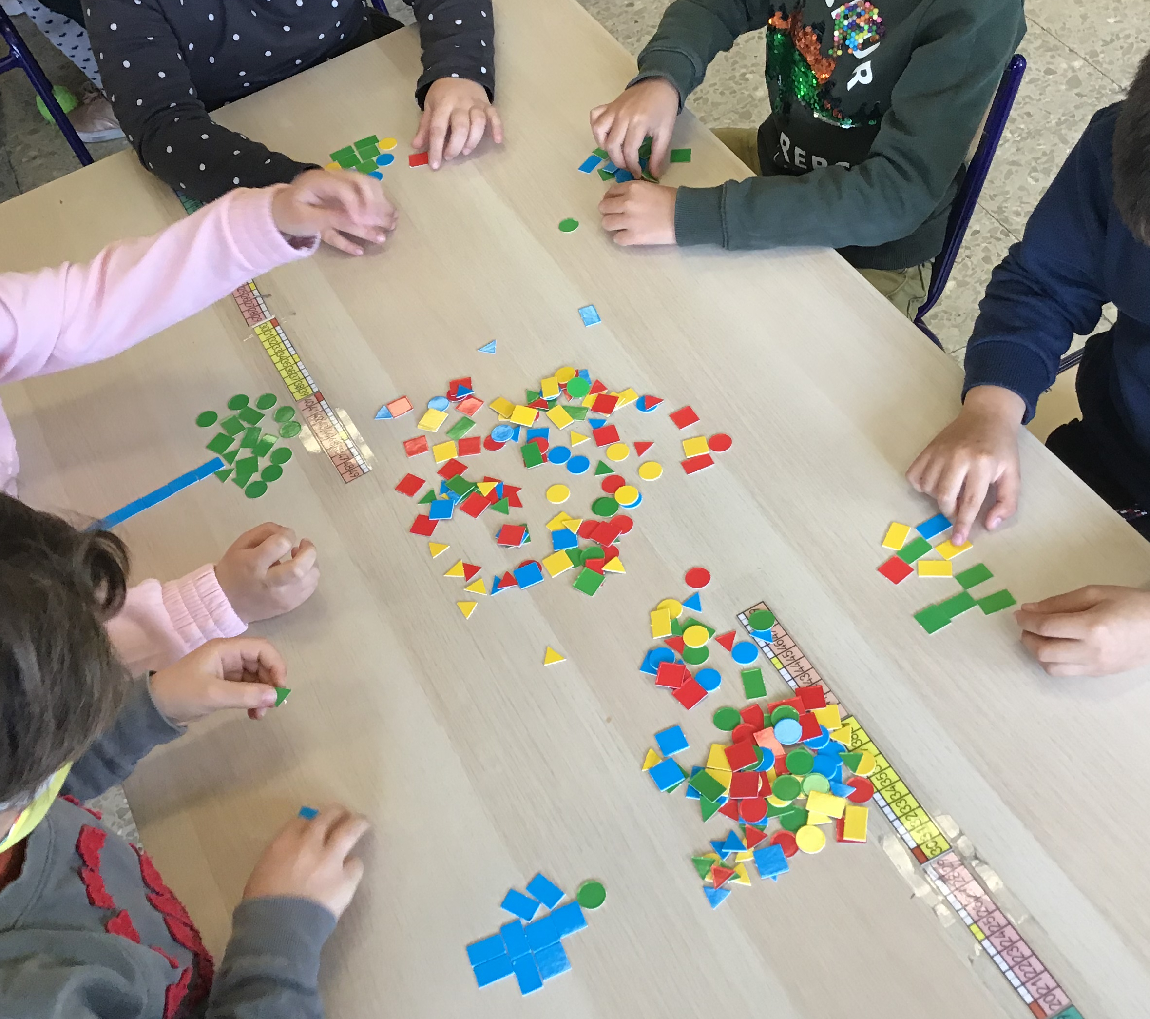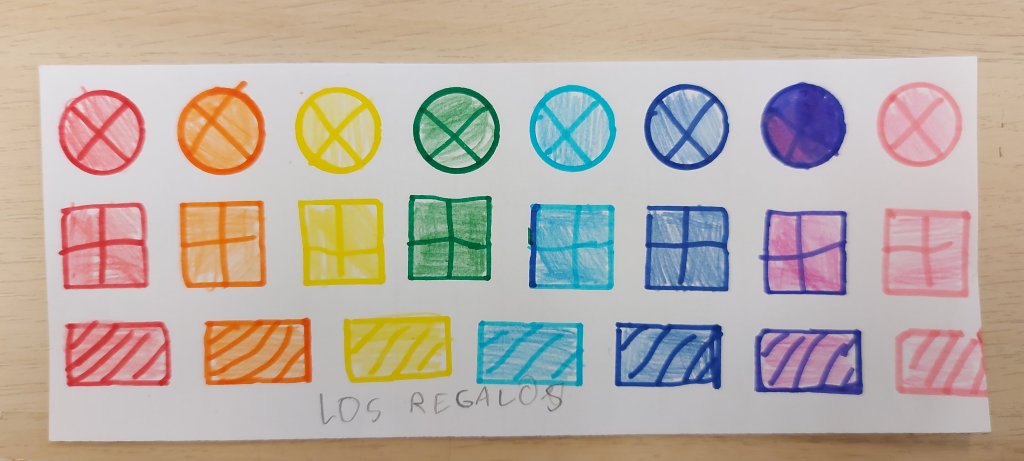 Disponemos de unos packs de figuras planas pequeñas, multicolor y troqueladas herencia de unos libros de ya no recuerdo qué editorial. De lo poco bueno que tenía eran este tipo de materiales que aunque eran escasos se agradecían.