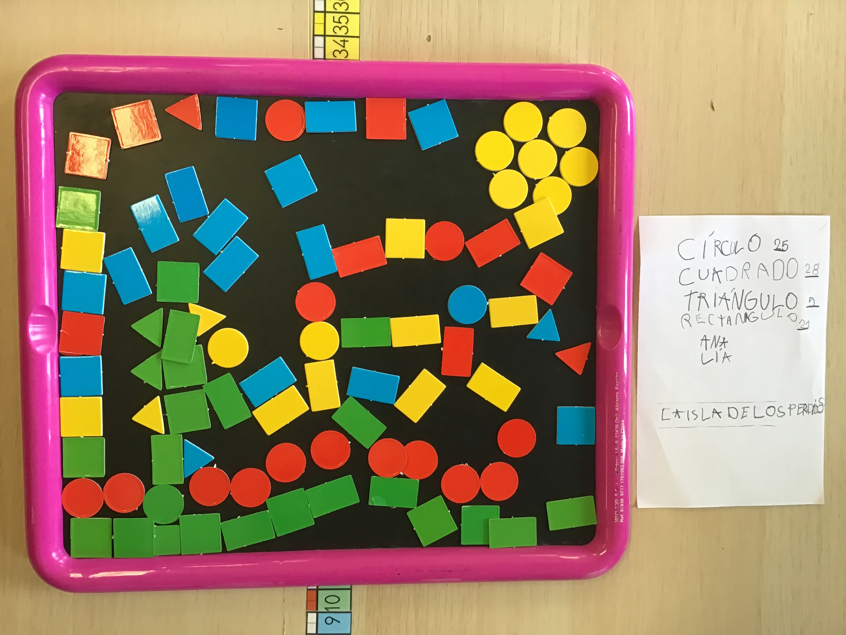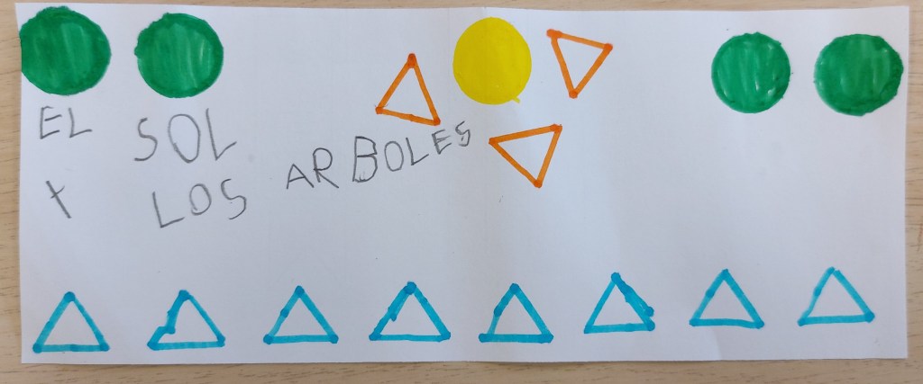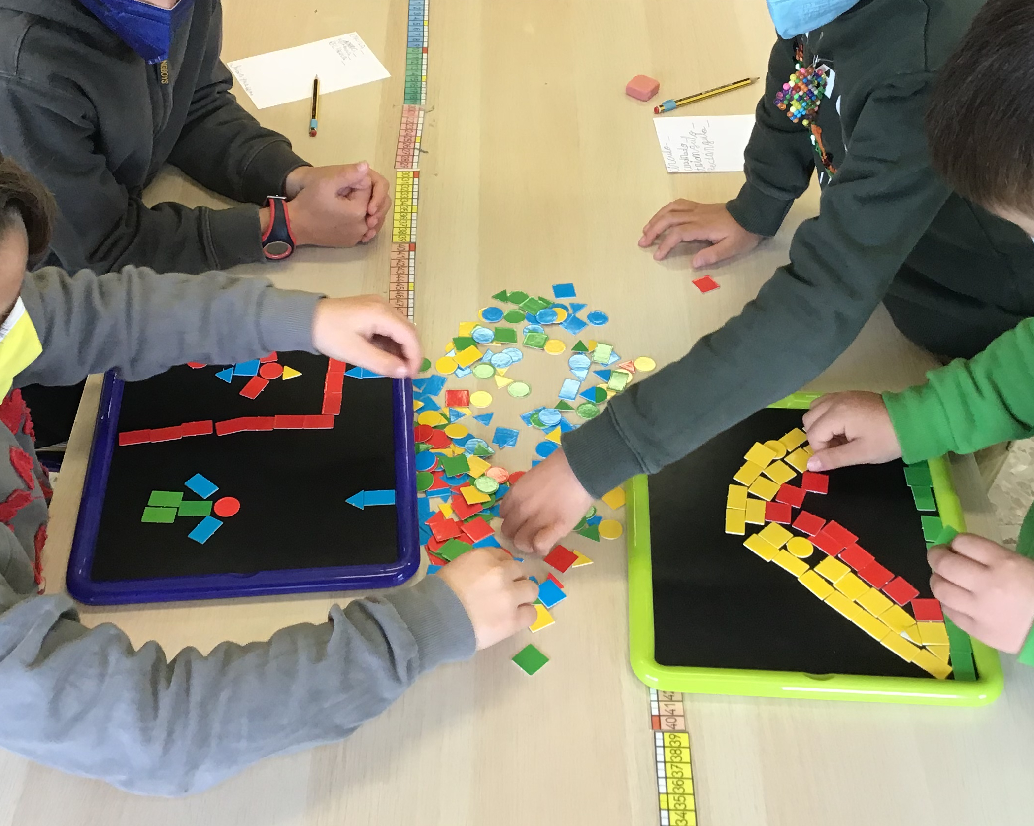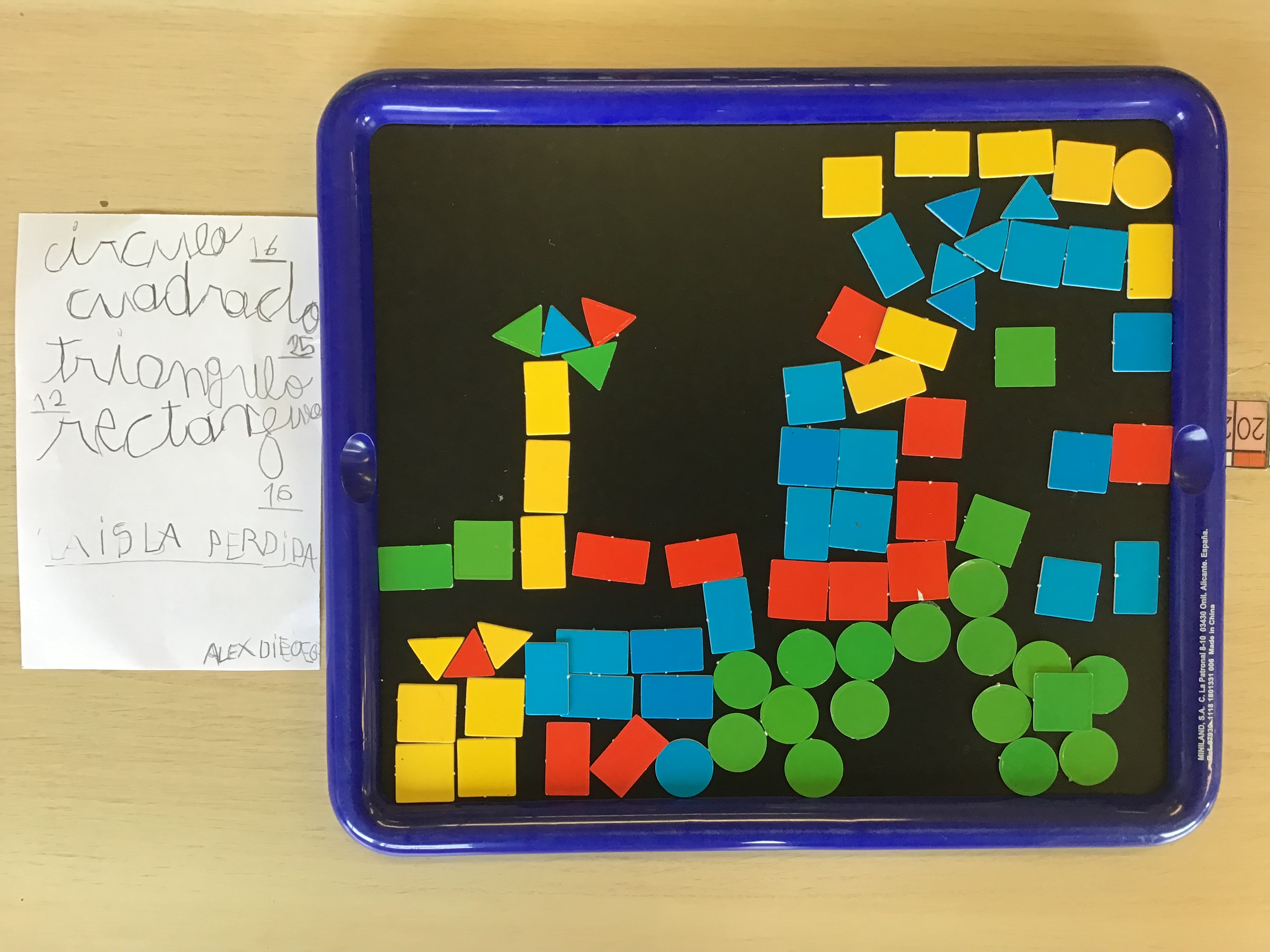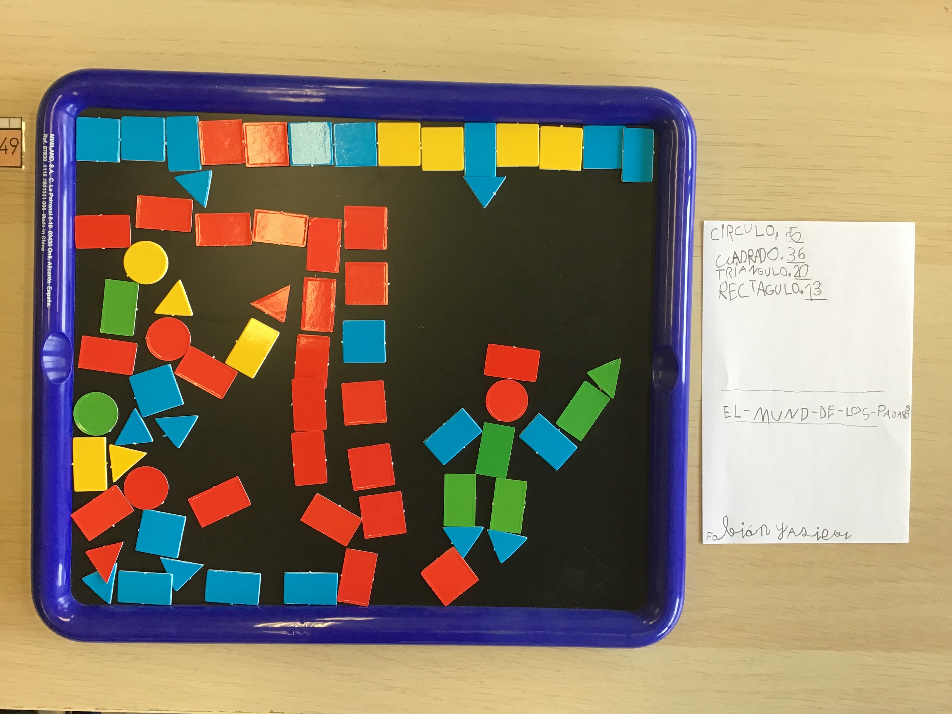 Se formaron parejas y se les proporcionó una pizarra a modo de marco. Se les invitó a crear algo juntos utilizando las formas geométricas. Una vez creado habría de registrar cuántas figuras habían utilizado y además titular su creación. Resultado: ESPECTACULAR.