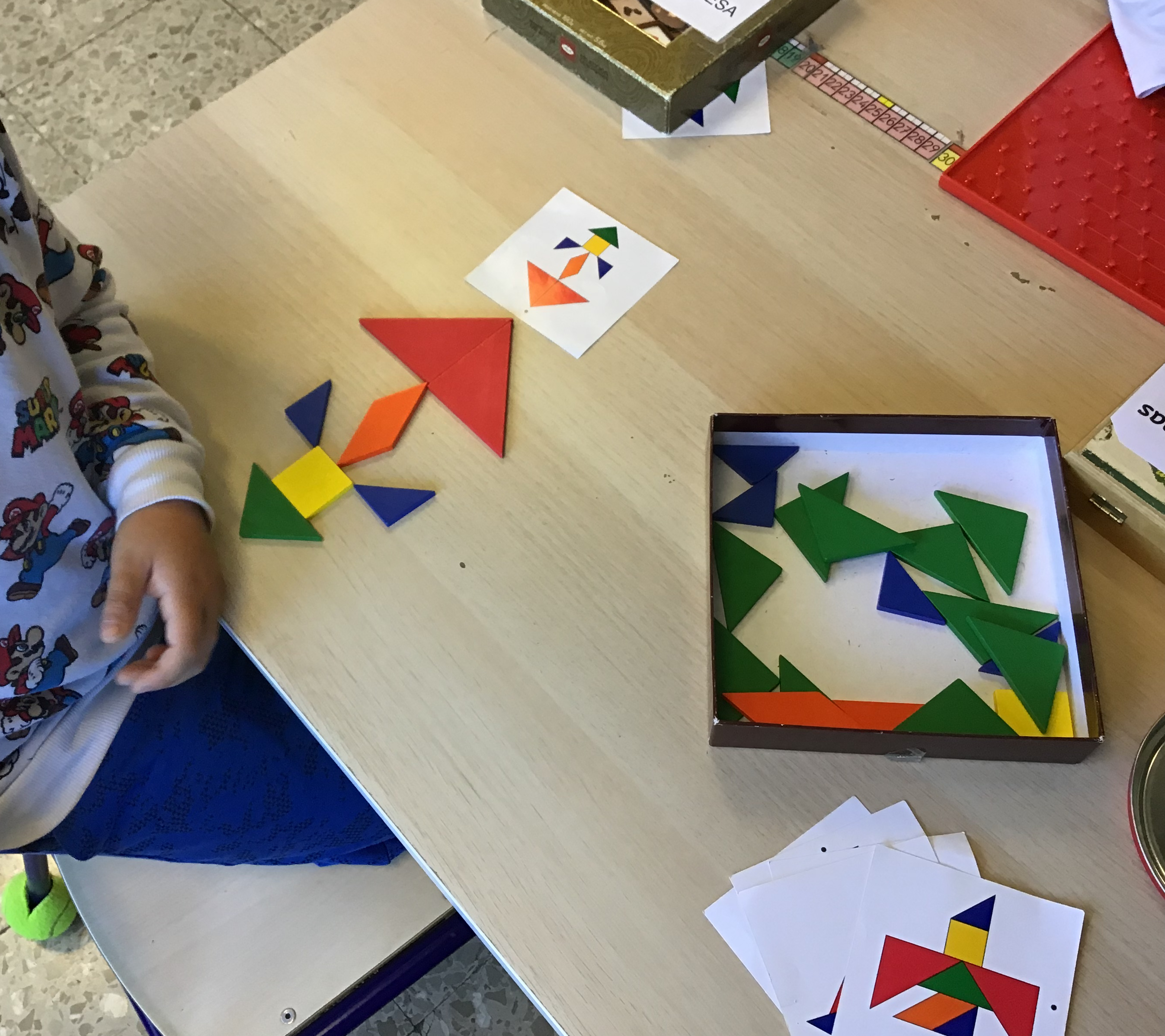 - Tangram de colores para formar figuras o patrones con plantillas de referencia,
