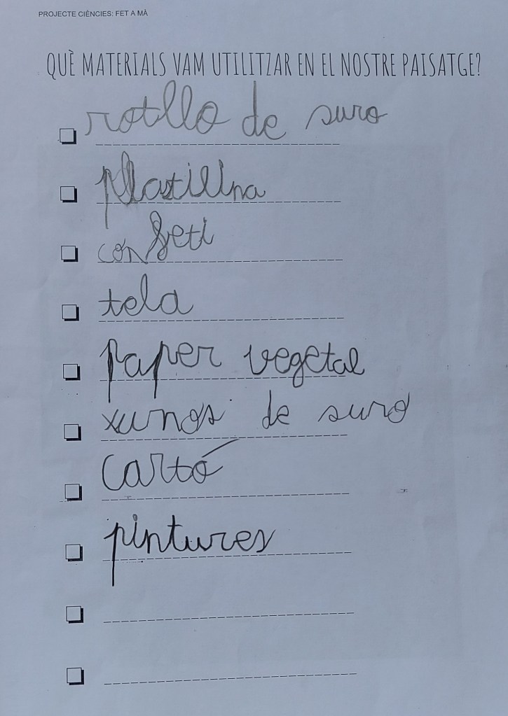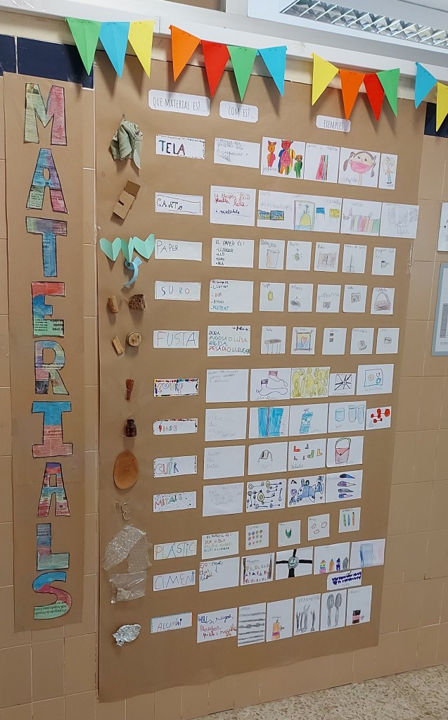 Cada equipo hizo un listado de los materiales que había utilizado para realizar su trabajo, y fue bastante interesante ver por un lado el bagaje que ya tienen sobre el vocabulario en valenciano, y por otro lado atender a las dudas que surgen sobre el origen de cada material.