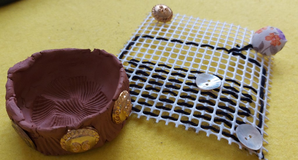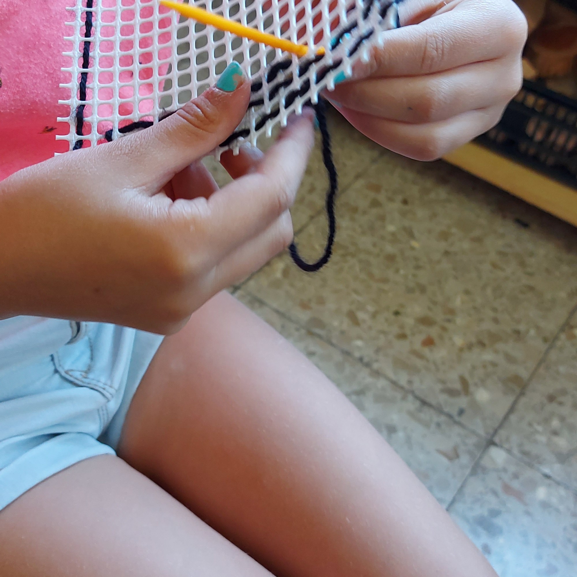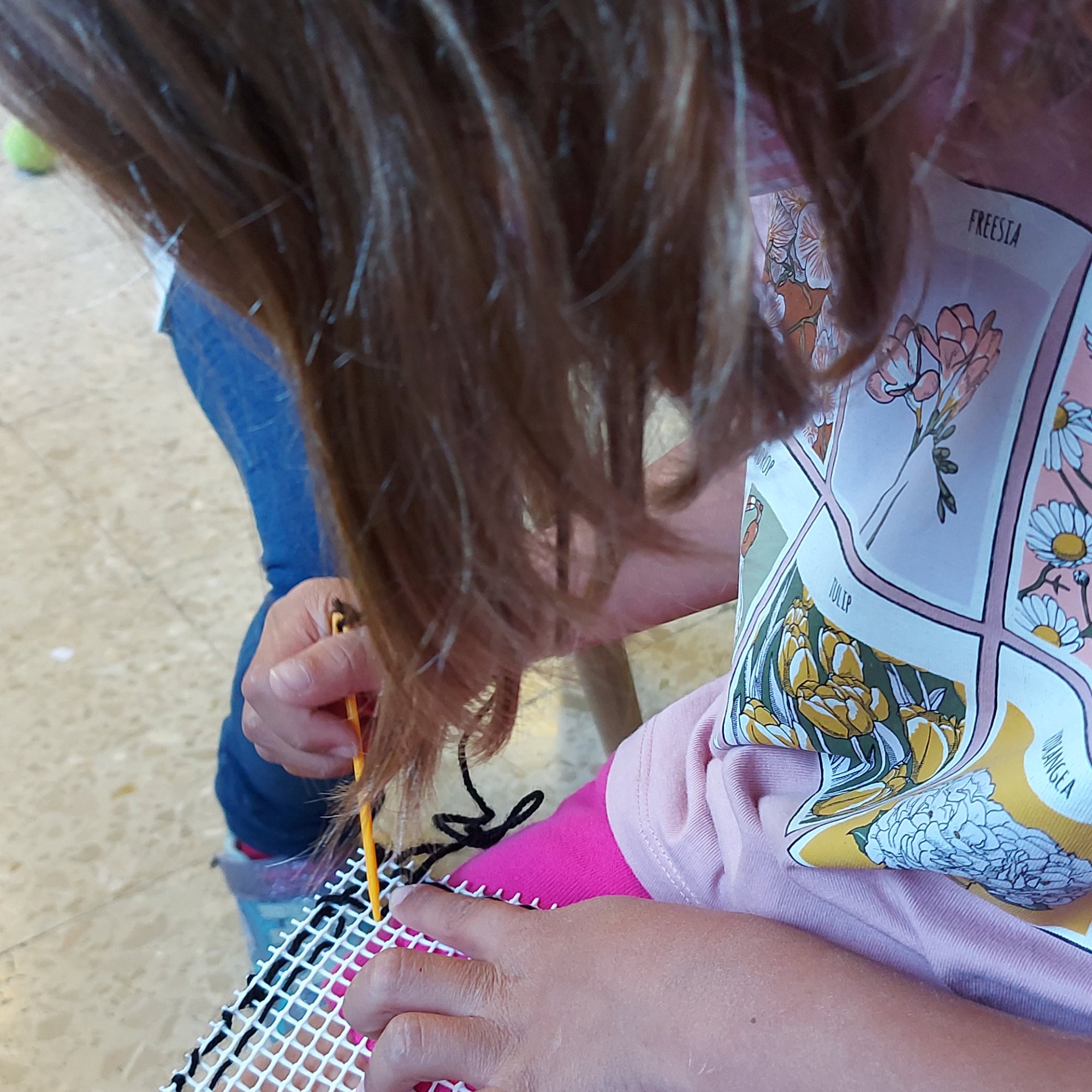 En segundo lugar un material natural pero procesado la lana tintada. Crearon preciosas y originales piezas artísticas. Usando como base un trozo de valla cada niño/a trazó el camino de cosido con aguja y mucha paciencia que le llevaría a obtener un resultado a la altura de grandes creadores/as.