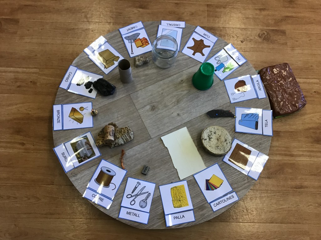 Elaboramos una Rueda de Materiales con diferentes muestras de cada uno de ellos que encontramos en el aula o en el colegio.