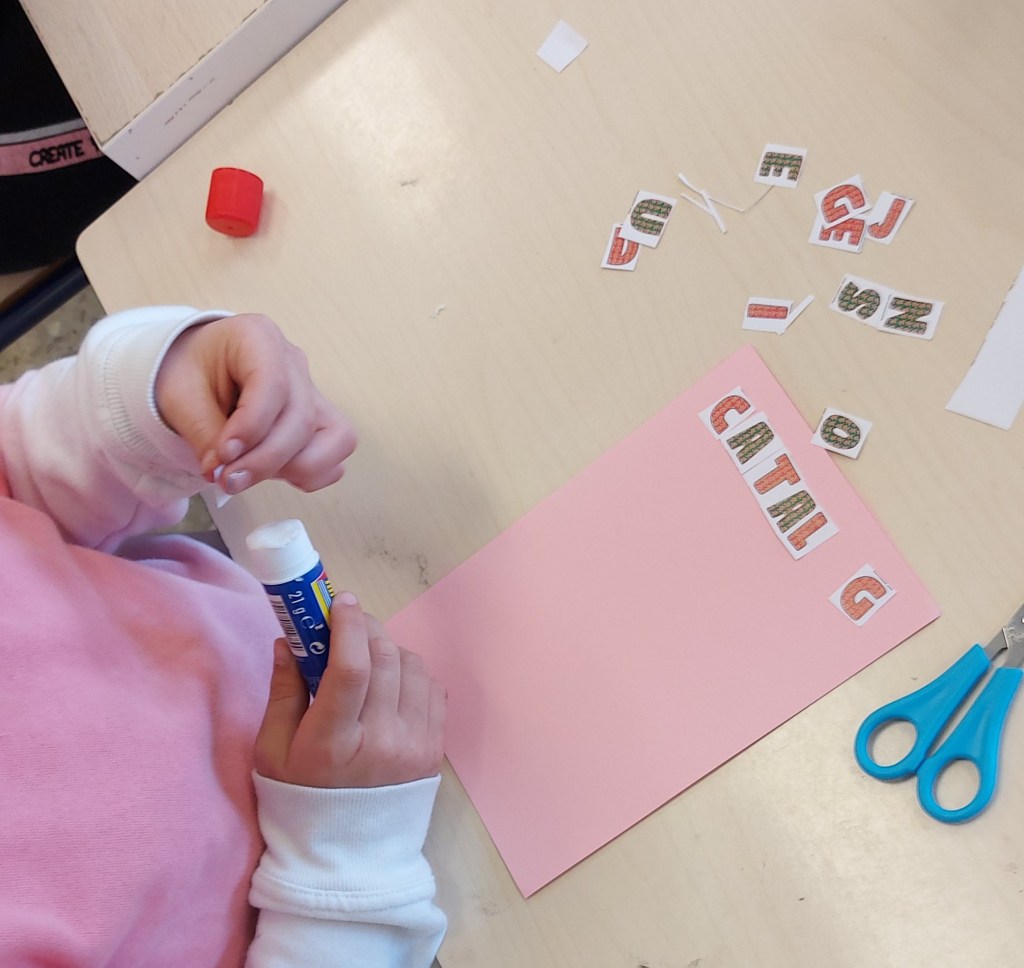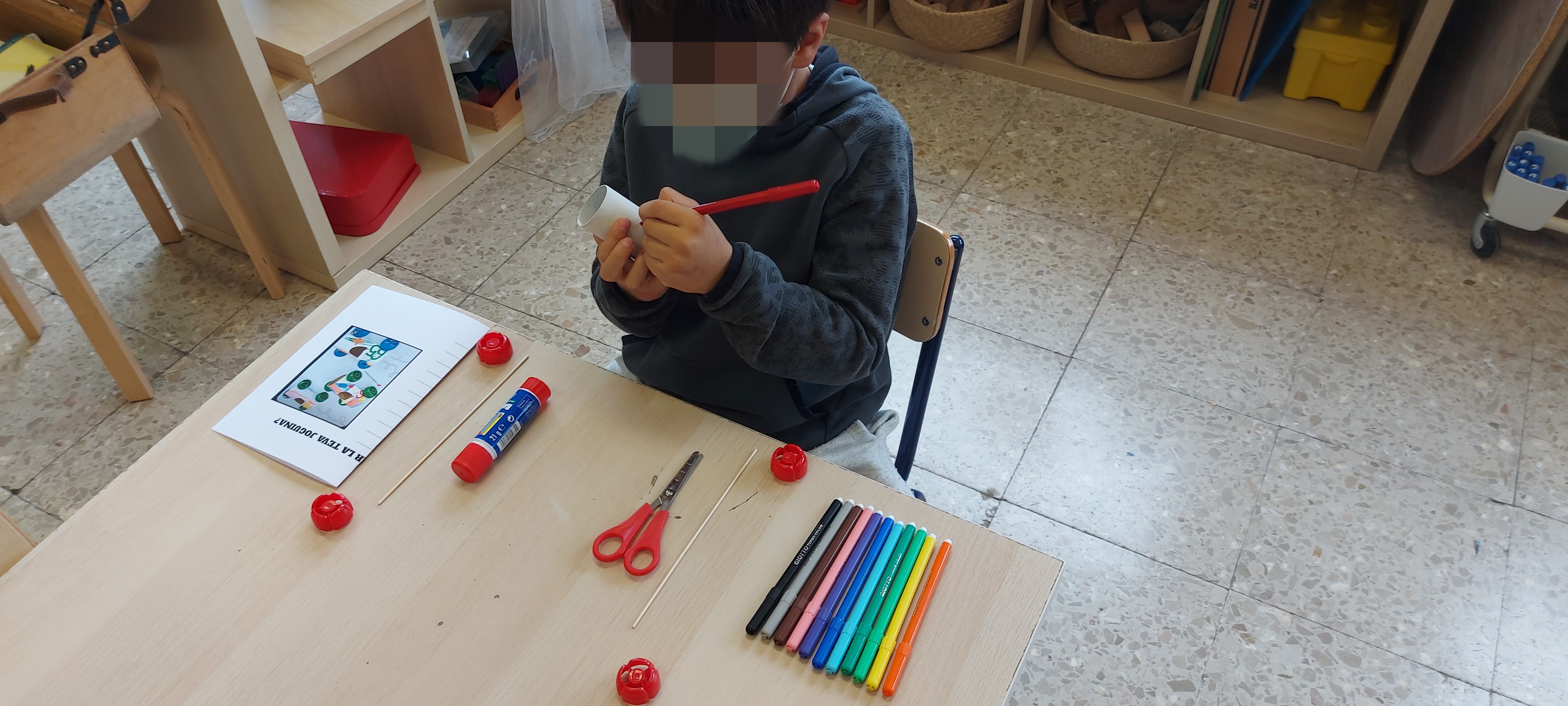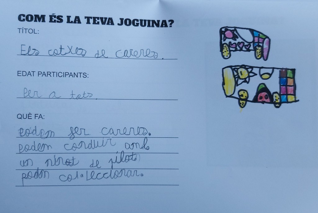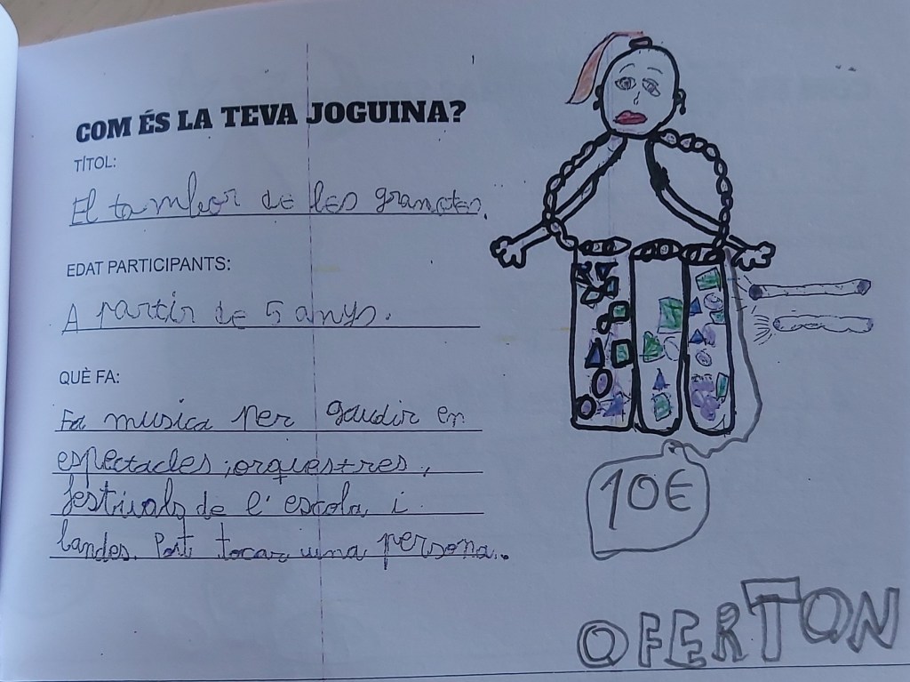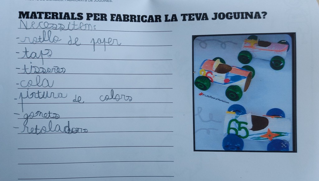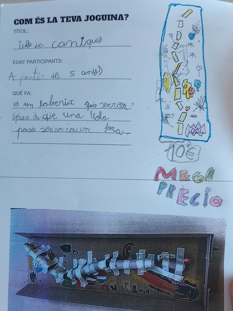 Una vez creados los juguetes trabajamos un poquito el vocabulario de materiales que había utilizado y también completamos una plantilla donde explicaban para quien era y para qué servía el juguete … información indispensable para su Catálogo de juguetes.