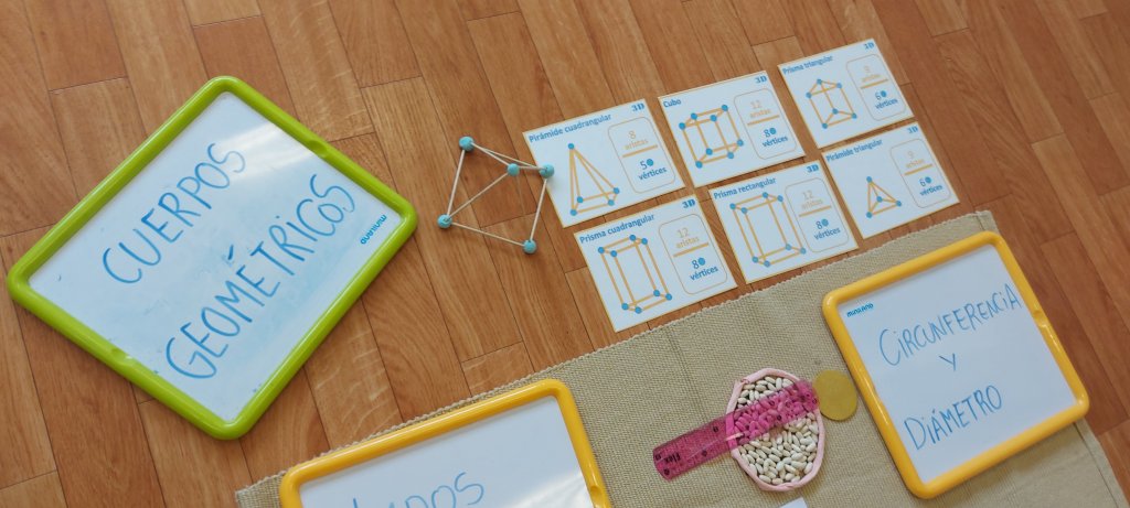 NOTA: material utilizado, tarjetas cuerpos geométricos, tarjetas construcción cuerpos geométricos, plantillas de talleres.