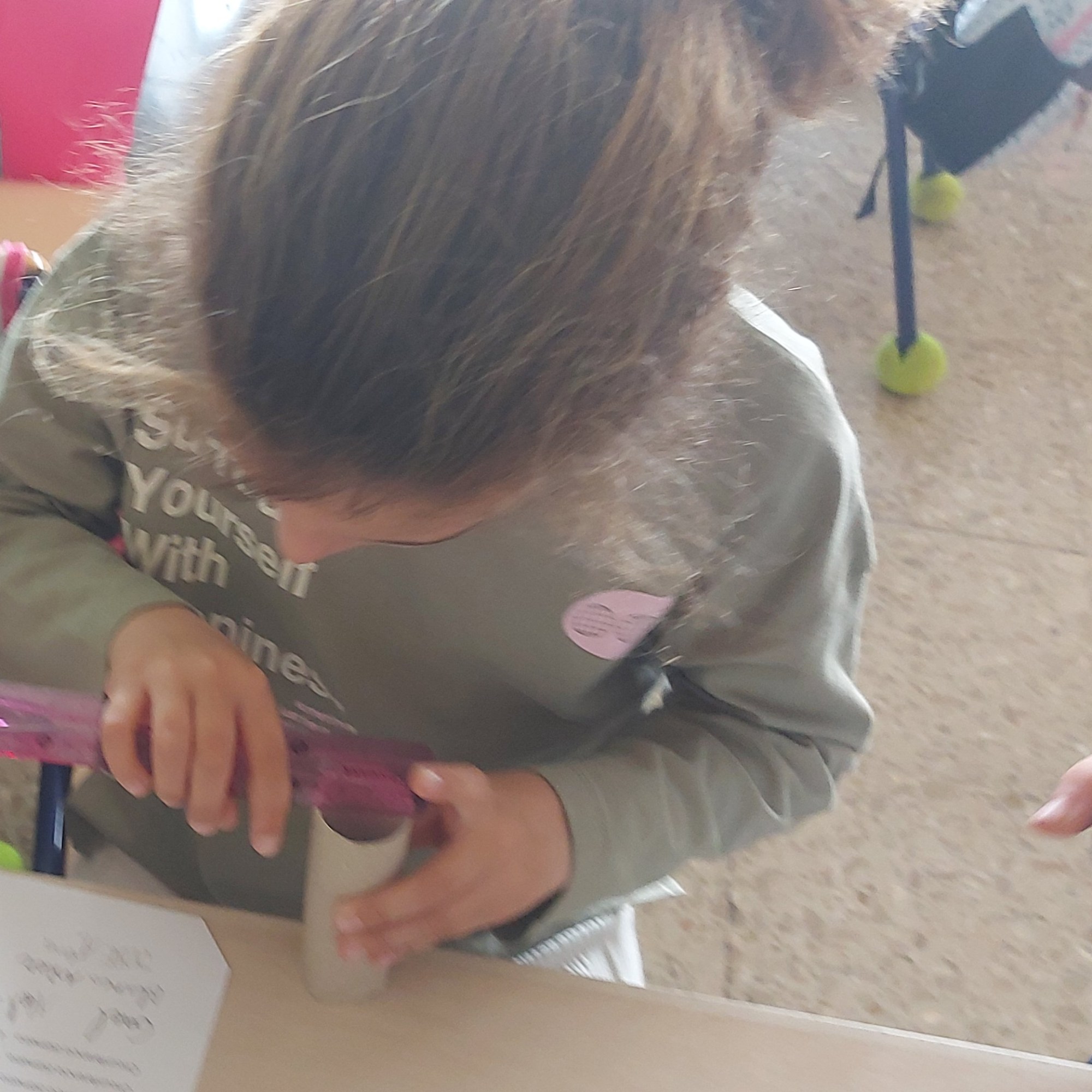 En el segundo taller debían estampar las distintas circunferencias que presentaban tubos de cartón (cilindros) siguiendo de nuevo un código de colores relacionado con la medida del diámetro de cada uno de ellos.