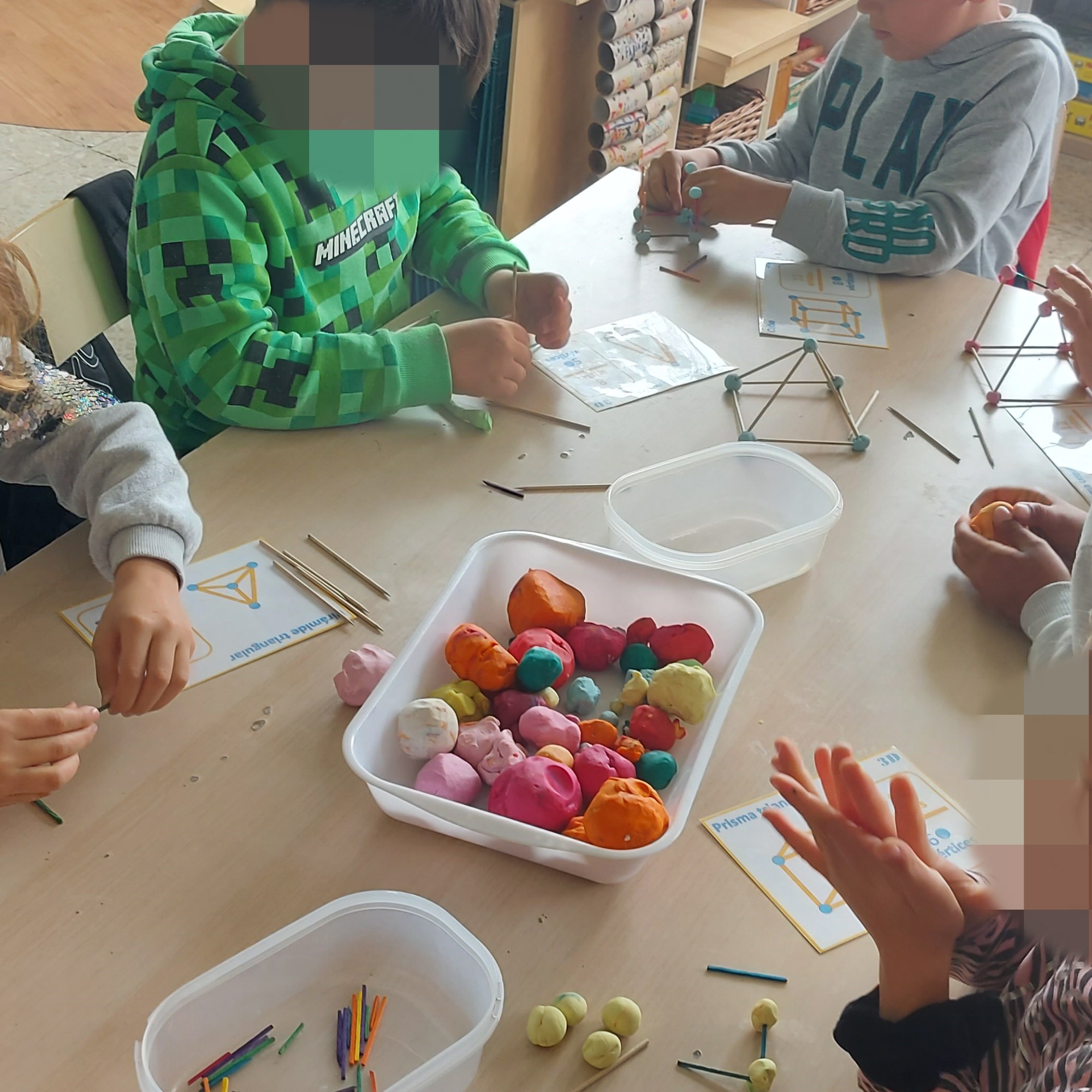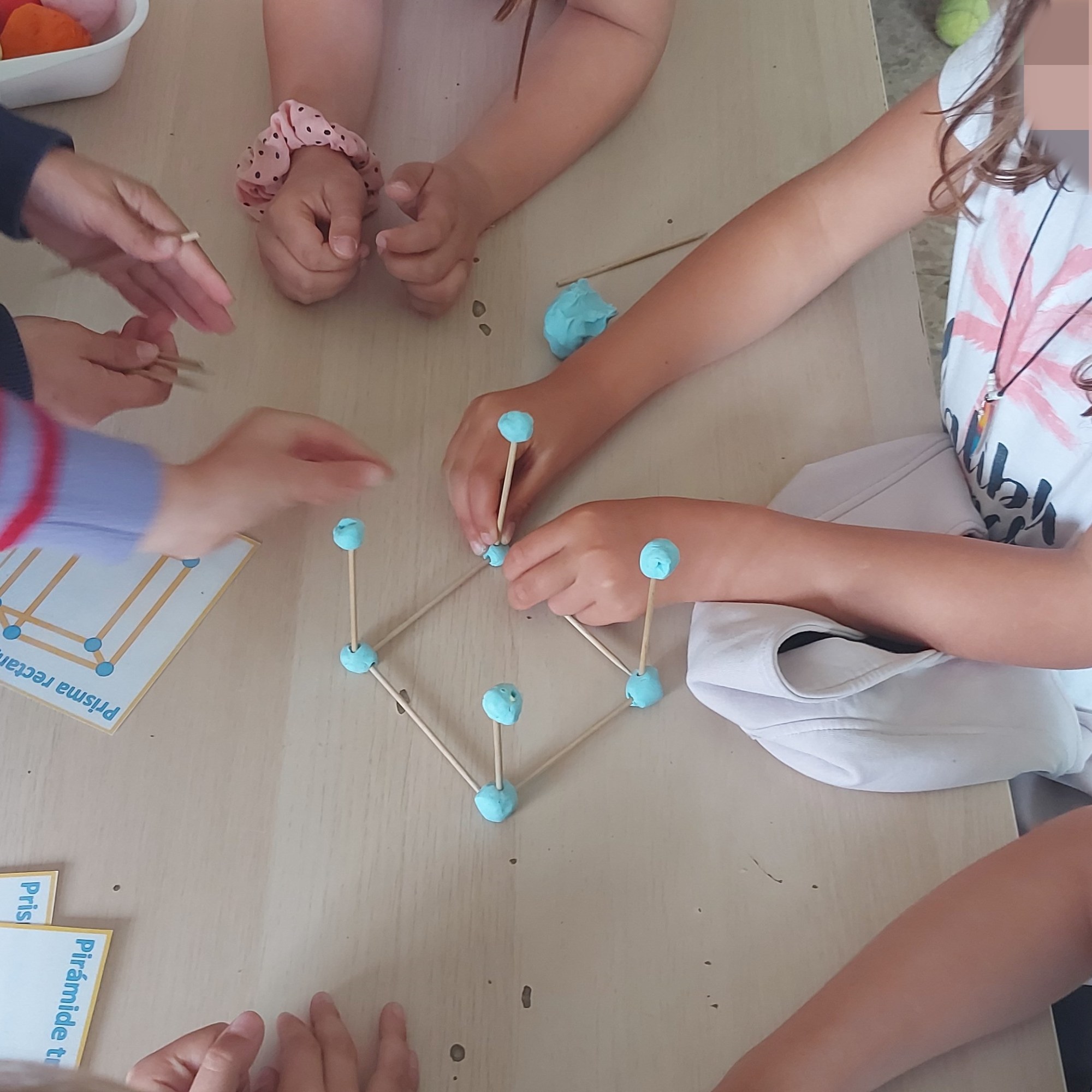 Y por último presentamos un taller donde les invitábamos a construir los cuerpos geométricos trabajados con palillos de madera y plastilina.