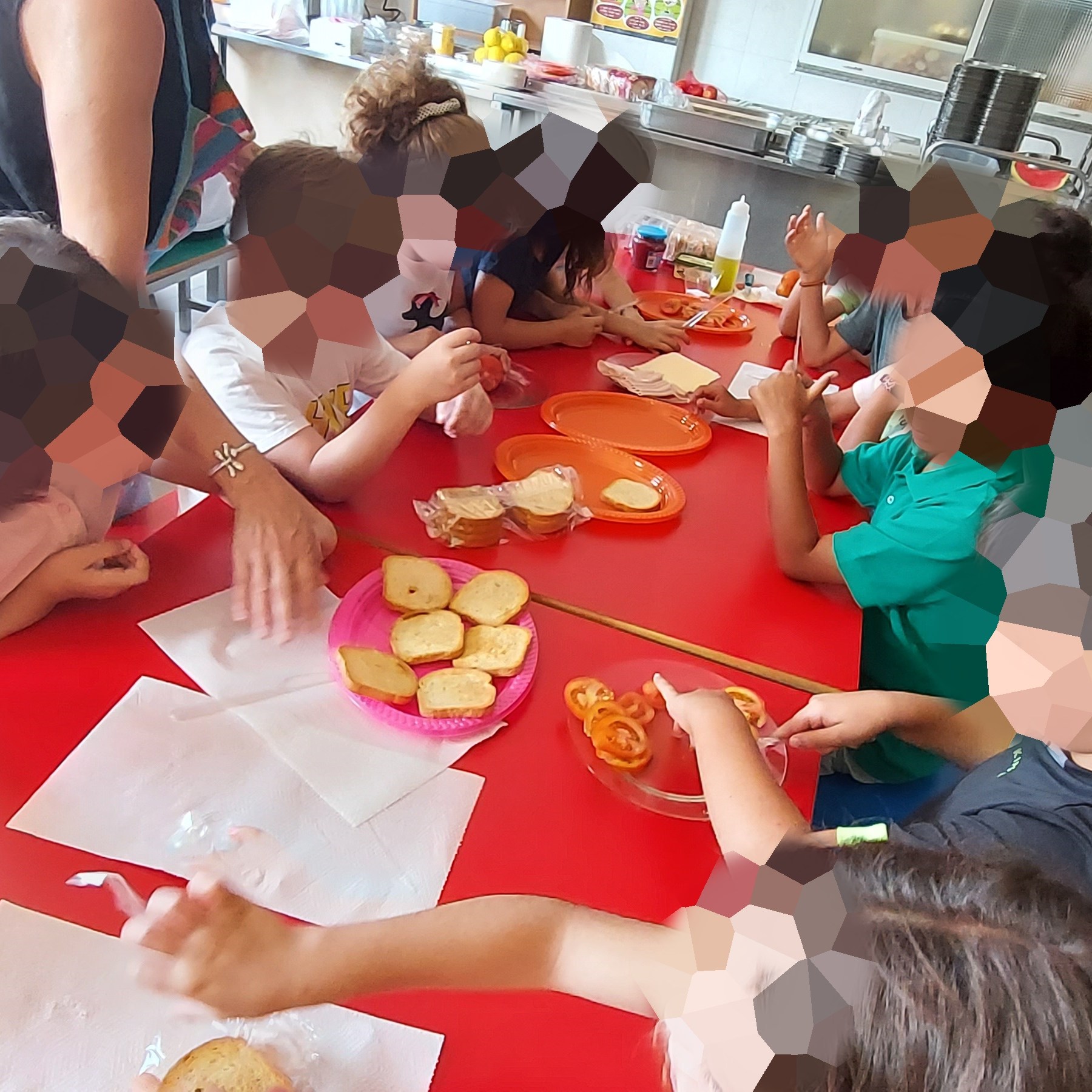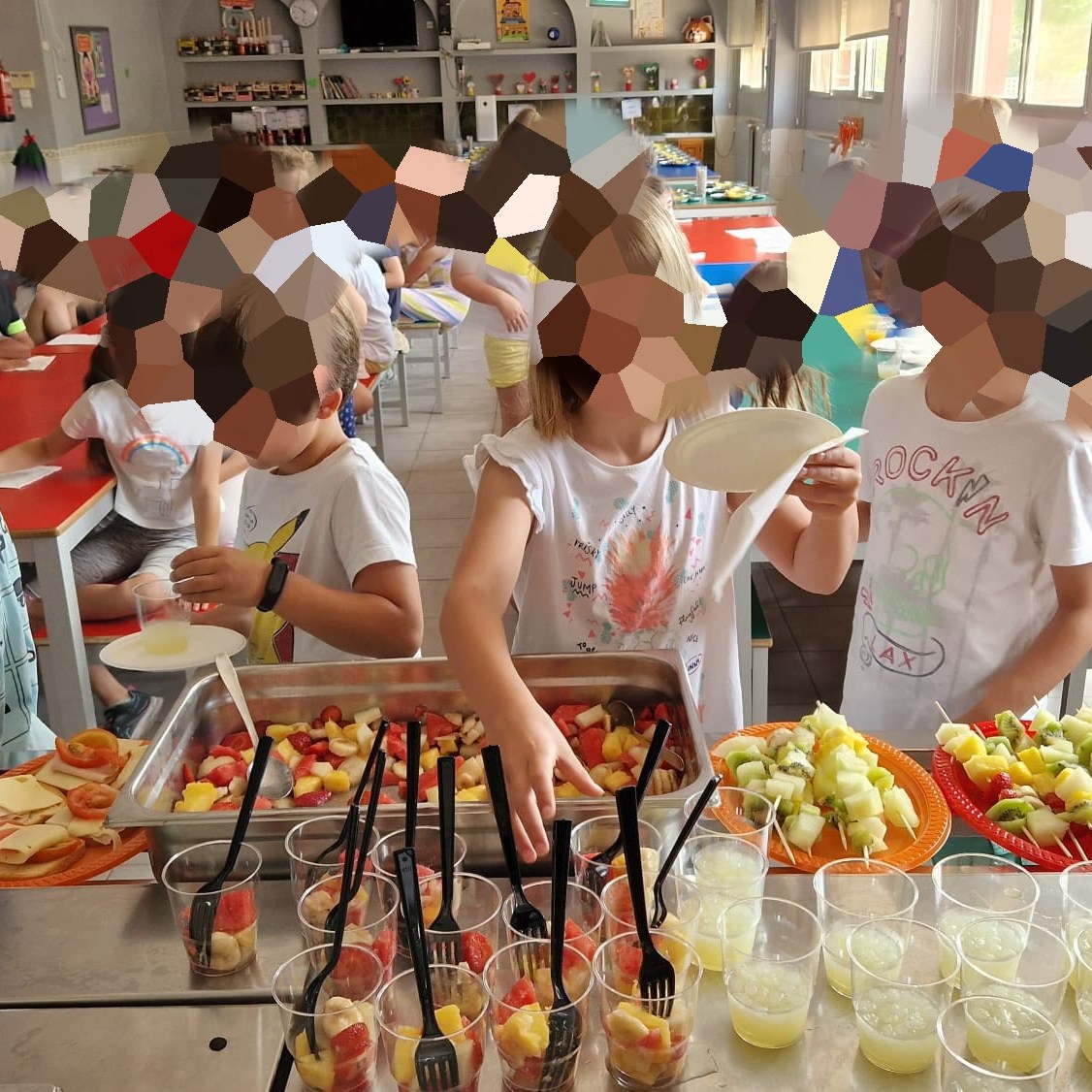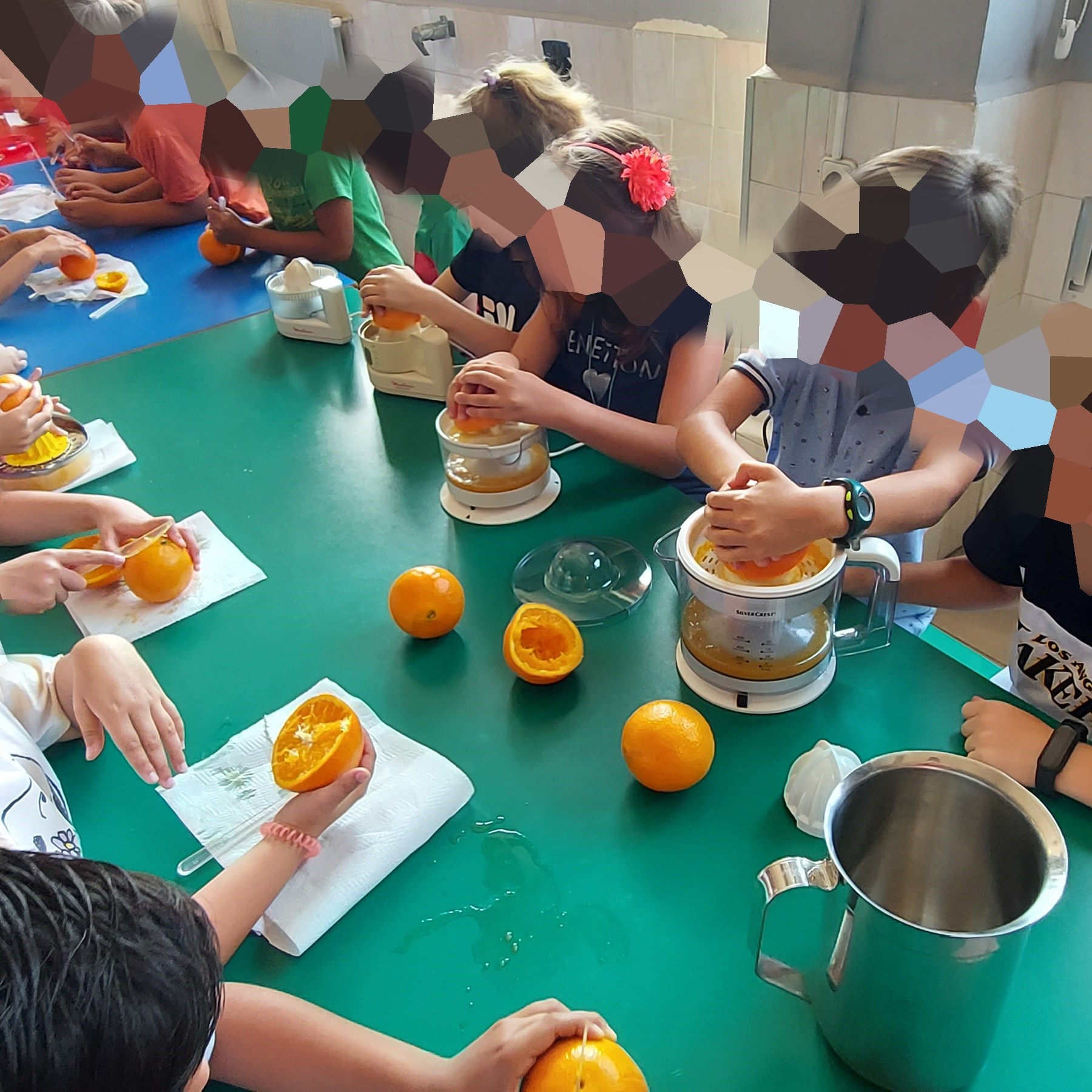 Ocupamos el comedor del colegio duranta un par de horas. Allí organizamos a 50 alumnos/as entre 4 profes. Nuestra sorpresa fue ver lo bien que se organizaron los equipos y la gran autonomía que tenían para pelar, corta o exprimir. ¡¡¡Fue un gran éxito!!