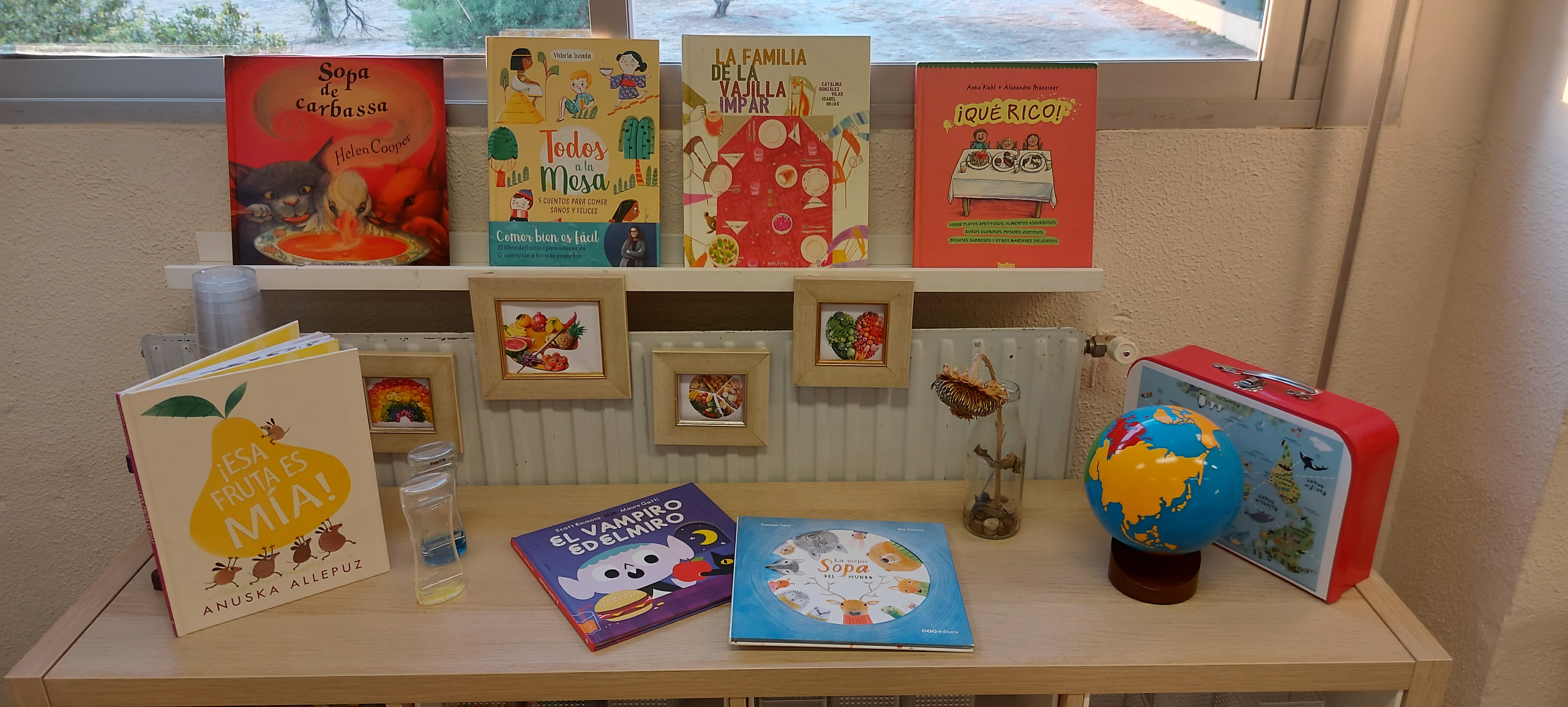 Para comenzar provocamos al grupo de peques con el descubrimiento de una bandeja de desayuno repleta de diferentes alimentos más o menos sanos y algo de literatura relacionada con nuestra nueva aventura.
