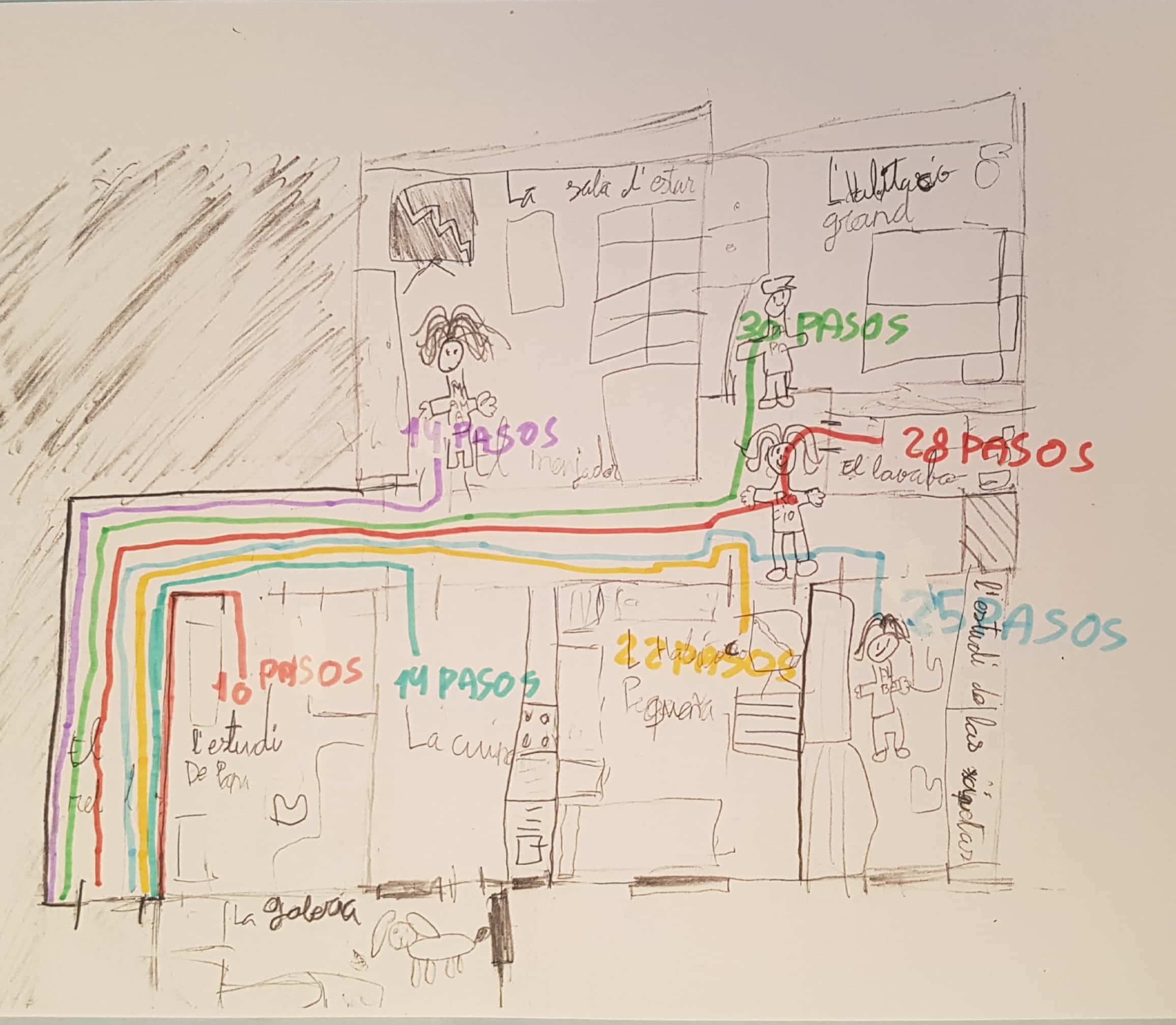 Mayo 2020, continuamos confinados y las propuestas para hacer en casa por parte de los maestros debían ser lo más lúdicas, creativas y originales posibles. ¿Qué mejor forma de introducir las medidas que investigando las distancias en casa? Presentamos el palmo, el pie y el paso con una divertida tarea: medir cuantos pasos hay desde la entrada de tu casa a todas las habitaciones. Así quedó uno de los planos… A. 8 años